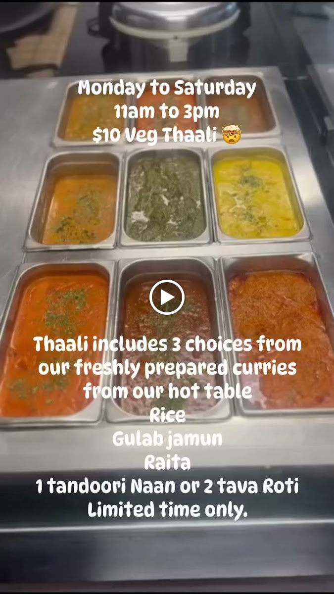 Try our Vegetarian Thali available starting at 11am everyday choose from a great selection of fresh indian curries from our hot table. Thali comes with 3 choices of curry, rice, dessert, raita (spicy yogurt). also comes with your choice of either 1 Naan OR 2 Tava Roti